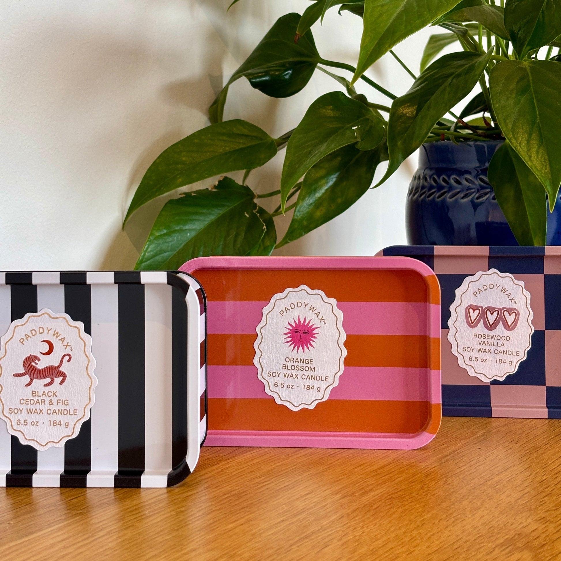 Glossy patterned tin candle with a whimsical label has been filled with bold fragrances to match the imaginative design and ignite your senses. Remove the label and you have a mini tray and trinket dish after the candle has burned!