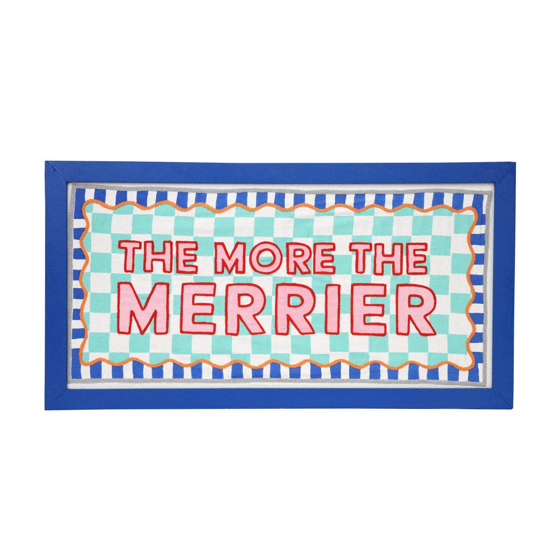 Our brand new wall art is a simple and effective way of injecting personality to any space. This ‘The More the Merrier’, sign is printed on turquoise checked fabric and features an orange wiggle inner border, blue striped outer and a rectangular silver trim. Framed and ready to hang in your home and spark some fun!