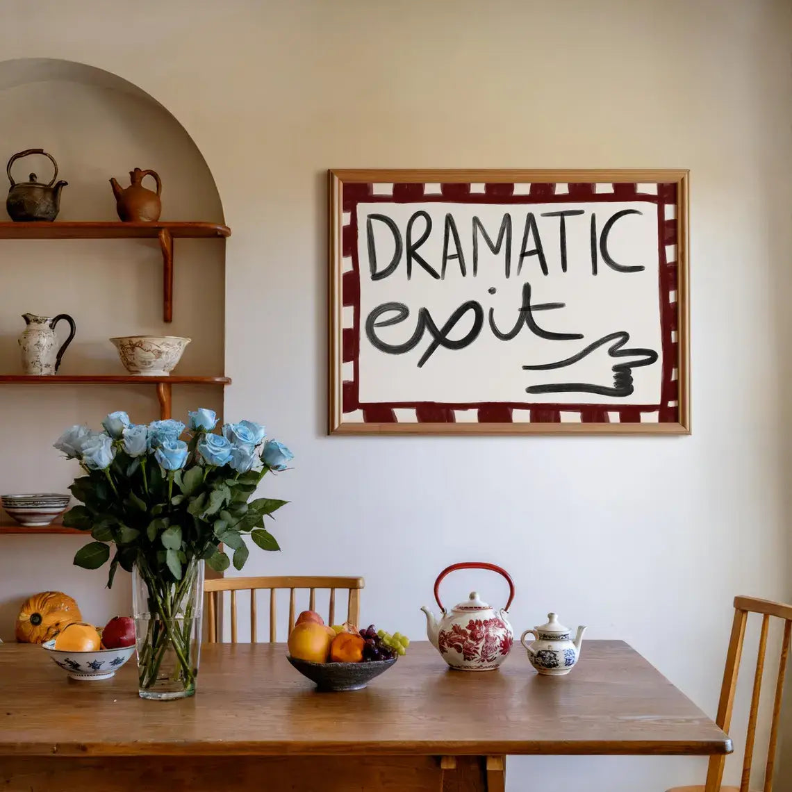 A playful print perfect for a hallway, ft the fun quote 'Dramatic Exit'. Add some fun and character to any space with this cheeky print.
