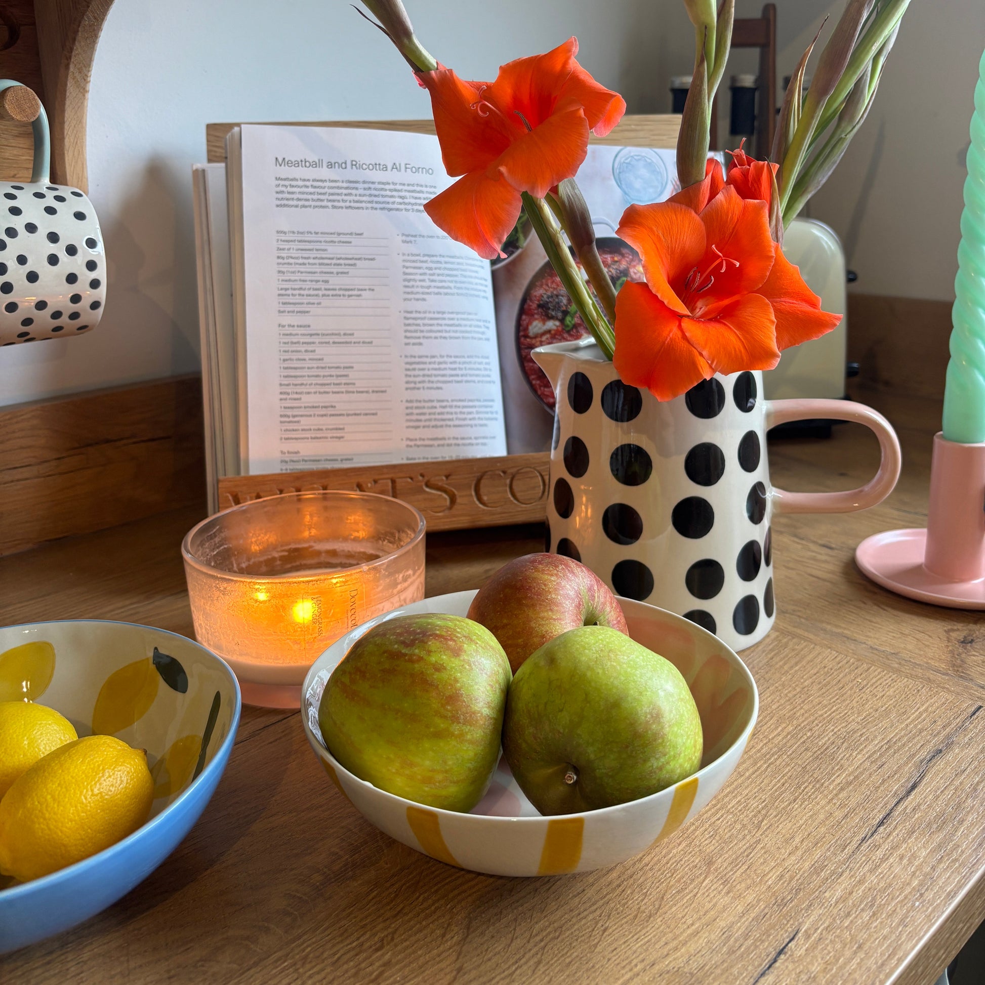 The latest addition to our kitchenware range is this beautiful hand painted glazed stoneware jug with an elongated pale pink handle. It's classic monochrome spot design will add an air of class to any kitchen style. Ideal for use as a water jug, a vase, or just a beautiful objet d'art.