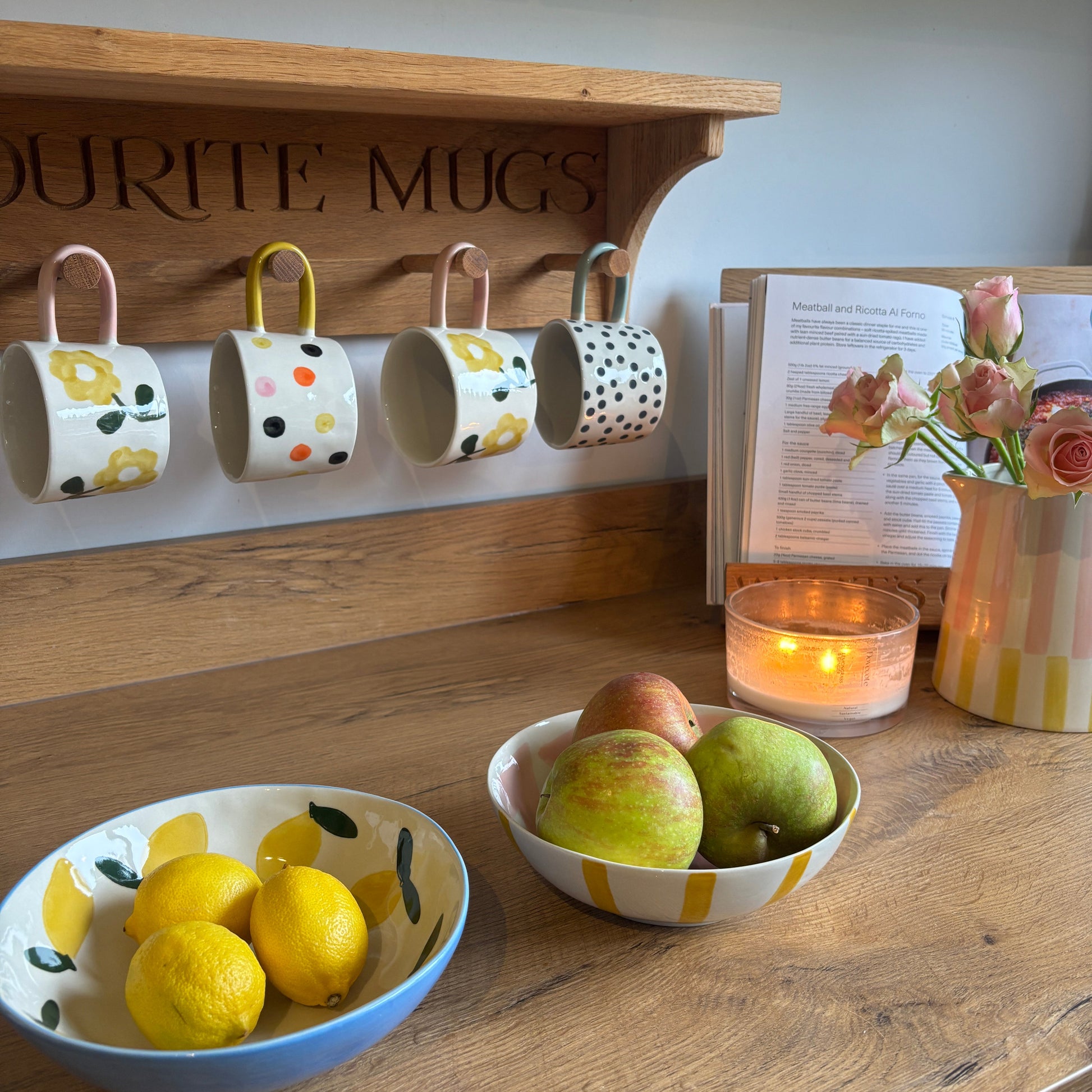 Hand painted glazed stoneware mug with stylish elongated handle. Please note these items are hand finished and will each display unique characteristics, so no two are exactly alike! And cleanup is a breeze - just toss it in the dishwasher.